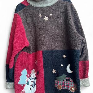 Rare vintage 2002 Multi-colored (red, black, and chocolate brown) silent night patchwork fleece coat/jacket with charming embroidered snowmen, Christmas trees, along with a landscape of the moon, and stars. Brand is C.J. Banks by Christopher & Banks. Size 1X. Good condition with some signs of wear and pilling (see photos please or ask for more if needed). Main callout is the missing button from the truck’s tire on the back of the jacket and loose thread. Otherwise, this cozy and festive coat has lots of life left.
