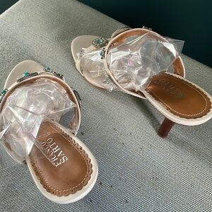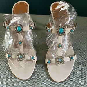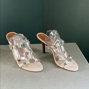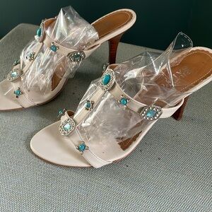 Rare vintage Franco Sarto Cream and turquoise and rhinestone embellished sandals