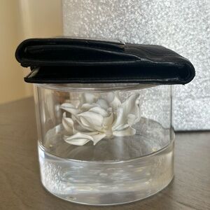 This Gucci vintage bifold wallet measures at approximately 4 1/2 x 4 1/2. Snap closure on both sides, with a coin compartment, 10 credit card slots, two money/paper compartments, and two extra side compartments underneath both credit card areas. This wallet is comprised of leather and canvas. Please see photos, and watch video for a through visual description. This wallet is used, but in great condition, with only very minor rubbing on two corners, as you will see in some close-up photos. The leather and the hardware are impeccable, and both snap closures are in full working condition.