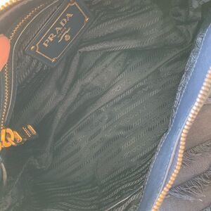 This is a medium-sized PRADA Vitello shoulder bag in navy ink leather, featuring gold hardware and a zip closure. Made in Italy, this authentic PRADA Milano bag has a stylish design with a width of 13 inches, height of 8 inches, and depth of 3 inches. The exterior material is luxurious leather, and the handle/strap material is also leather, giving it a sophisticated look. This elegant shoulder bag is perfect for women looking for a high-quality and fashionable accessory. Comes with C.O.A. Pristine stripes like these are hard to find.