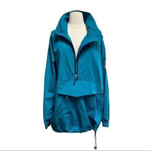 I’m a vintage windbreaker collector, and NEVER seen one like this! No one else will have this! It has a built in backpack on the jacket. Waterproof. 2 front side zip pockets. One front middle zip and envelope flap pocket. Adjustable cinch hem. Optional Side zip closure under left arm to hem, but mainly pullover with 1/4 front zip closure. Ideal for hiking / climbing / camping / outdoors. Excellent vintage condition. Some VERY minimal signs of wear. (Like a teeny spot or two) See last zoomed in photo for reference. No major noticable flaws. Tag is Men’s S/M. Would say that’s pretty accurate as my fiancé is modern day men’s large, and it’s too tight on him. I’m a women’s S/M and it’s too big on me. I would say it’d best fit a Men’s S/M. Will list as both, but there’s only ONE jacket available.