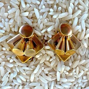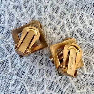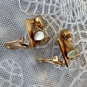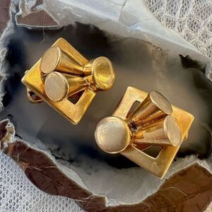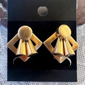 Gold tone clip-on retro classics. Suitable for any earlobe. Signed on the clip. Modernist geometric design. Approximately 1” on the diagonal.