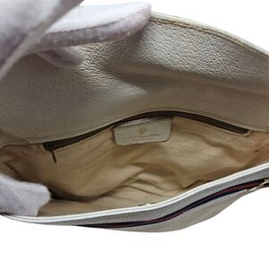 From Gucci’s 1980s Anniversary Collection, this rare vintage crossbody features white GG monogram canvas with a bold blue and red web stripe and elegant gold-tone hardware. Fold-over front panel and adjustable white leather strap for versatile wear. Slight stiffness due to age, but overall very good vintage condition.