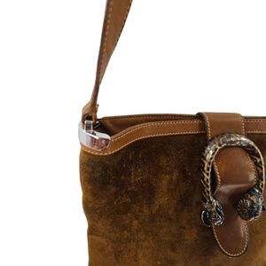 This rare vintage Gucci Dionysus bag is a true collector's treasure, showcasing luxurious tan suede and iconic enamel tiger head details on the flap closure. Designed in the 1970s, this piece reflects Gucci’s timeless craftsmanship and bold elegance. The bag's structured silhouette and refined hardware make it a statement accessory, perfect for display or styling.