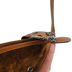 While the front snap closure does not stay shut, all components remain intact. The bag’s overall condition is good for its age, with no major flaws beyond this minor issue.