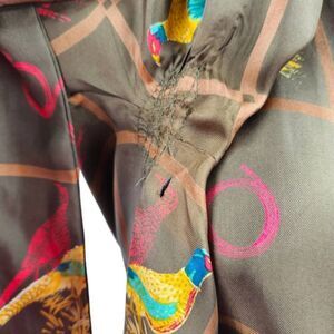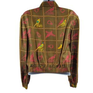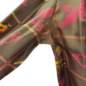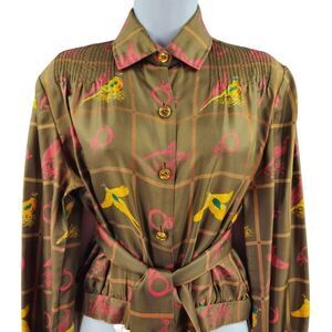 This exquisite vintage Gucci silk blouse is a true collector’s treasure, showcasing a sophisticated olive-brown grid pattern adorned with vibrant quail and horn illustrations in shades of yellow, green, and pink. Crafted from luxurious 100% silk, the blouse features heavy gold-tone metal buttons, a structured collar, and elegant smocking at the shoulders. A matching silk tie belt cinches the waist, creating a flattering silhouette, while long buttoned cuffs add refinement. This piece is a testament to Gucci’s unmatched craftsmanship, making it perfect for collectors or those seeking a bold, vintage statement piece.