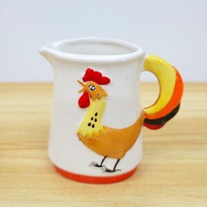 Charming mid-century Holt-Howard rooster ceramic individual creamer, dated 1965. Features a bright hand-painted rooster with a colorful tail doubling as the handle. Classic Holt-Howard whimsy with playful detailing and retro farmhouse flair.