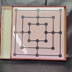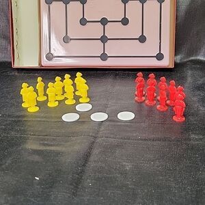 A nice vintage game. It has a plastic board and 9 men each yellow and red. The box shows a little wear as shown in pictures. Made by Schaper's 1960's
