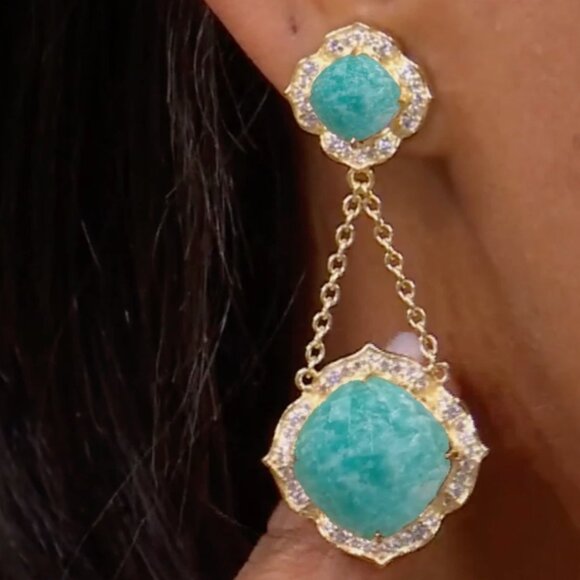 Rarities Carol Brodie Gold-Plated Cushion Amazonite & Zircon Drop Earrings Nwt