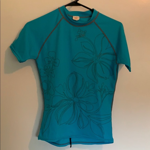 Blue short sleeve rash guard with gray hibiscus outline print. Like new.