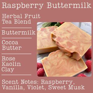 Ingredients: Herbal Fruit Tea (Distilled Water, Hibiscus, Roasted Chicory, Orange Peel, Blackberry Leaves, Raspberry and Raspberry Leaves) Organic Coconut Oil, RSPO Palm Oil, Olive Oil, Sodium Hydroxide, Rice Bran Oil, Shea Butter, Avocado Oil, Castor Oil, Sal Butter, Cocoa Butter, Buttermilk, Fragrance Oil, Rose Kaolin Clay, Sodium Lactate