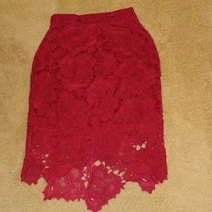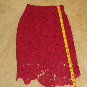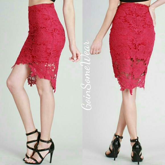 This Raspberry Skirt haves embroidered crochet material and a high-low style. This skirt goes over your waist line and in the back is lower. The length of the skirt in back is 27" inches with zipper in back of skirt.