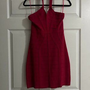 Raspberry (redish), form fitting mini dress, with ribbed texture and stretch material. Slight v cut front, with hater top closure and open back. Never been worn size medium.
