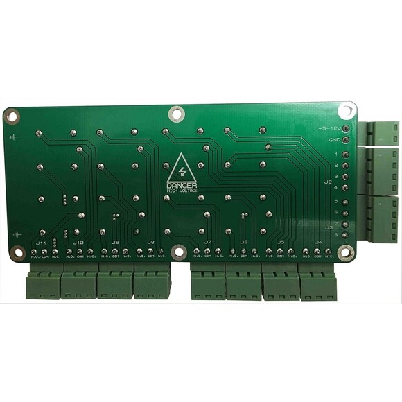 Relays Deck - The relays module provides the ability to control the switching of various electrical devices. Сharacteristics: * Power supply 5-12V DC (protected); * Signal voltage 3.3-5V DC (not protected); * 8 input connectors; * 8 output connectors (COM, N.C., N.O.). Connect the module to the Raspberry Pi through a Communication Deck. The modul