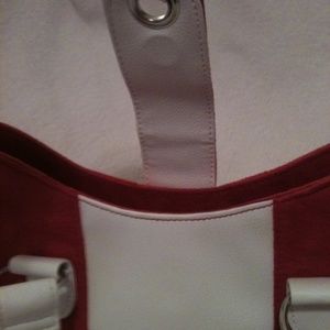-- HANDBAG CLOSES WITH A ZIPPER AND A MAGNETIC FLAP WITH TWO WHITE LEATHER TASSELS ATTACHED TO MAGNETIC CLOSURE FLAP