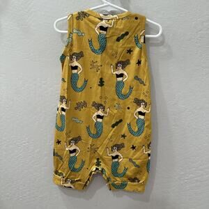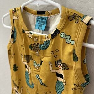 Raspberry Republic tank romper size 80/86 (9-18 months). Mustard yellow background featuring fun mermaid print. Henley button detail on front. Super cute! Good condition for a few spots.