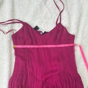 This vibrant raspberry mini dress boasts a sleeveless design with delicate spaghetti straps and a v-neckline. The fit and flare silhouette is perfect for a cocktail night out, offering a playful and elegant look. Its lightweight fabric and flowy skirt ensure comfort and style for any occasion.