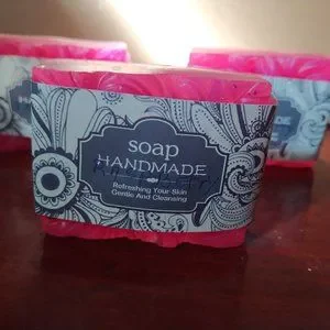 glycerin soap base with raspberry fragrance oil. Smells so good. Is moisturizing to the skin and has great lather.