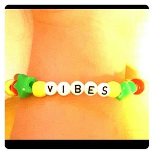 Handmade kandi bracelet. Says "vibes", rasta color scheme, featuring 2 star beads and a chill smilely face bead. Ribbon in picture is my business tag and is removed before wear. Rabbit Tail accessory made by Bunny.