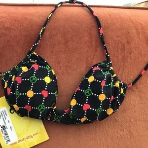Rasta Girl black triangle bikini top with multi colored designs groove to the sound of the ocean, creates the ultimate party attitude. Ties at the neck and back, awesome comfort, fit, and design. The moderate cut triple spaghetti strap bikini bottom completes the look. New with tags! EXTRA -SMALL TOP, lightly padded (removable) and SMALL BOTTOM. Nylon & Spandex.