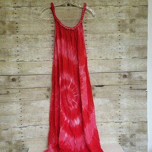 Very good used condition tie dye sun dress. This was purchased during a cruise and has only been worn a few times. It's only been hand washed. There are (woo?) beads covered in fabric that make up the straps and continue around the neckline. 200% Rayon. Please note that on the back neckline there is no stitching between 2 of the beads.