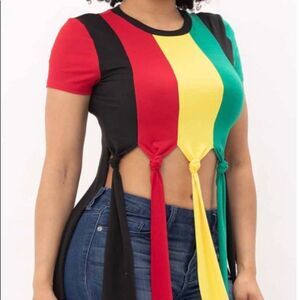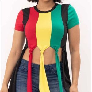 Knot detailed short sleeve multicolored top in Rasta colors red, yellow (gold), green, and black