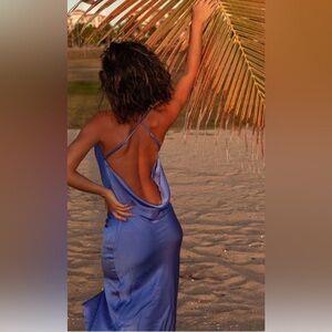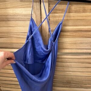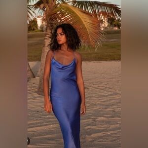 The slim crossed straps and double cowl of this elegant midi style add a touch of nostalgia. Satin feel Cross back detail, Cowl front & back , Adjustable straps Midi length