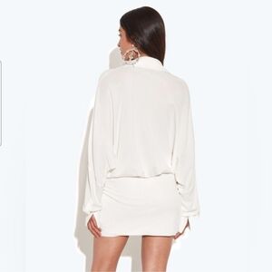 Elegant white midi dress. Deep V-neckline. Long sleeves. Perfect for any occasion.