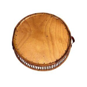 Rattan Round Serving Tray Wicker Leather Handles VTG 70s Kitchen Farmers Market