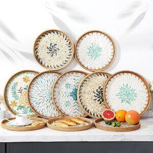 Elegant Design: The mother of pearls inlay adds a sophisticated and luxurious touch to the rustic charm of the rattan. This round wicker tray effortlessly blends with any home decor style like boho and farmhouse.