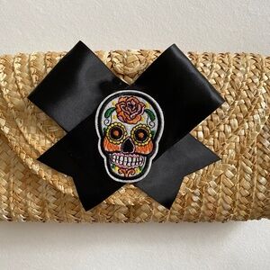 Handmade rattan straw clutch with black satin bow and sugar skull. Snap closure, the inside is fully lined, measures, L 10.5", H 6", D 2.25".