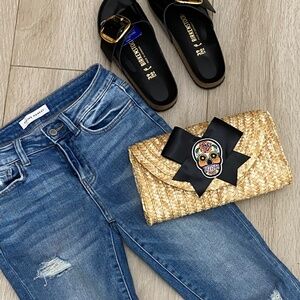 Rattan Straw Clutch with Black Bow and Sugar Skull