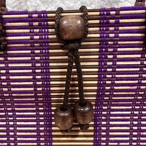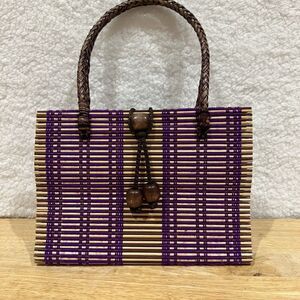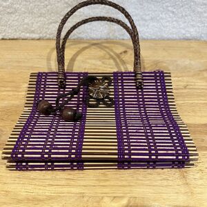 Rattan Woven Purple Purse Handbag w/ Handmade Beaded Closure & Braided Handles