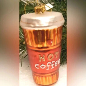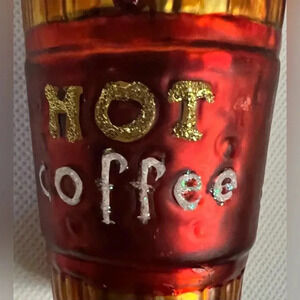 Blown Glass Hot Coffee travel mug ornament. Attached tree hanger. Perfect for your favorite coffee drinker or secret santa gift. Like new condition.