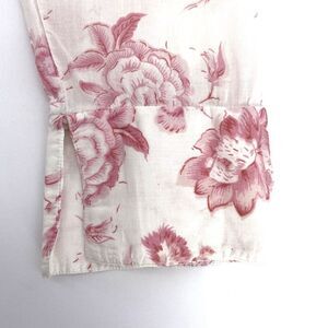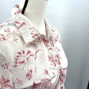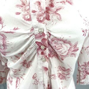 Rave Y2K Top Sz M Rose Print Ruched Semi Sheer Shirt Pink White Cottage Coquette