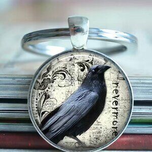Round keychain featuring a raven design with silver accents. Perfect for adding a touch of mystery to your keys.