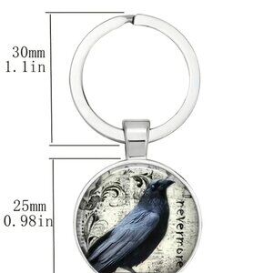 Round keychain featuring a raven design with silver accents. Perfect for adding a touch of mystery to your keys.