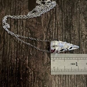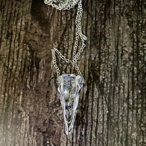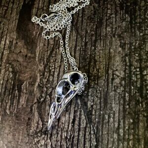 Purchase is for one silver colored raven skull pendant necklace. Raven pendant is made of zinc alloy which is lead and nickel free. The skull measures about 1 inch long. The necklace chain is made of stainless steel and measures 18 inches long. Brand new handmade by me!