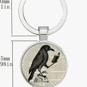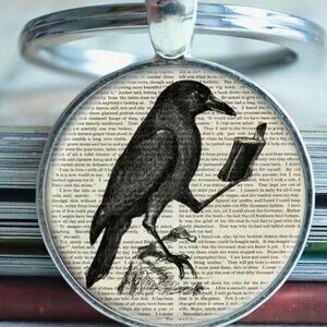Unique keychain featuring a raven holding a book. Perfect for literature lovers.