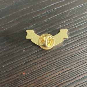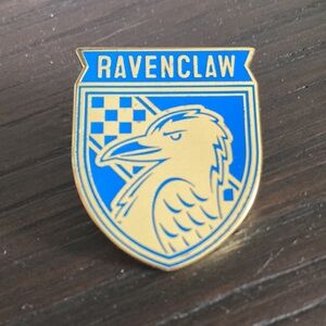 One crest that says Ravenclaw and one smaller banner that says Wisdom. Both are blue and gold, with metal pin backs.