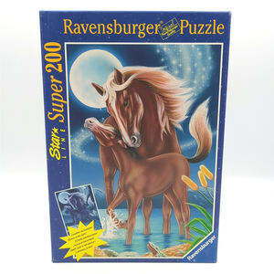 Ravensburger Star Line Super 200 Piece Puzzle. Features a painting of Horses in the Moonlight. Glows in the Dark. The Puzzle is complete. The Box has some wear as shown in pictures.