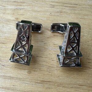 Add a unique touch to your collection with these Ravi Ratan cufflinks. Crafted from 925 sterling silver, these bullet back cufflinks feature an oil and natural gas petroleum industry rig derrick shape and a 1-inch length and weigh 16.1 grams. The vintage design and rare sharp detail make these cufflinks a must-have for any collector or fashion-forward individual. These 1" cufflinks are signed by the designer Ravi Ratan and are handmade in the United States. The metal purity is stamped with purity hallmarked 925 sterling silver, and the base metal is silver. These cufflinks speak to the American energy industry full of petroleum engineers, geologists, technicians, landmen, drillers, roughnecks, tool pushers, company men, finance people, refinery personnel, pipeline specialists, operators, and many other people involved. These cuff links are in excellent pre owned clean condition with trace use or handling wear. Please review the pictures for more details and size measurements.