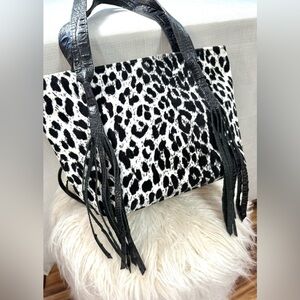 Raviani Black and White Leopard Print Bag with Black Fringe Tassels