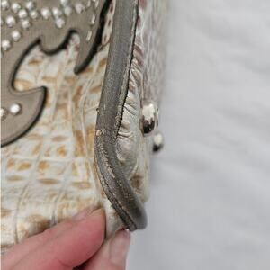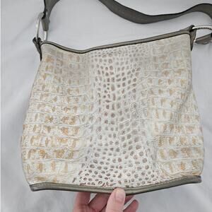 Raviani Multicolor Croc Embossed Leather Fleur De Lis Rhinestone Bucket Bag. some condition from use as pictured. no rhinestones are missing. measurements are approximately: 10 x 10.5 x 5 inches.