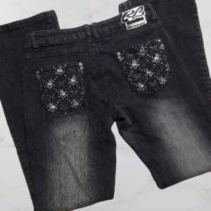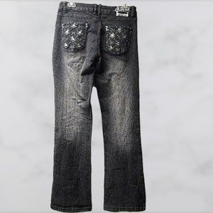 Black and silver jeans with skeleton embellishments on the front and back. One thread on the back pocket is loose, but pocket is intact. No wear at cuffs.