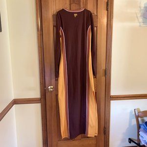 Dress is a pull-on long sleeve stripped with two shades of brown, gold with a white piping accent. Dress is maxi length with dramatic side slits, with a puffed patch like New York on the front surrounded by stars in a size large.