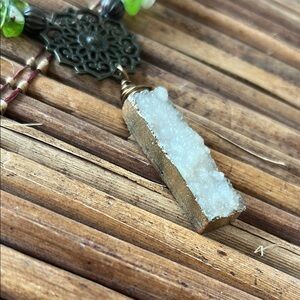 Make a grounded statement with this handcrafted necklace featuring a raw-cut druzy quartz bar pendant, wrapped in antique bronze wire and suspended from an ornate mandala-style medallion. The strand is accented with green gemstone chips (possibly peridot or jade), opalite-style beads, and vintage metal detailing for a nature-inspired finish.