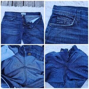 Dark wash light weight stretch denim w/ factory fading, sanding, whiskering. 5 pocket, button/zipper fly, skinny silhouette, cropped ankle length w/ raw cutoff frayed hems. Issues noted in photos. Good preowned condition, overall. No style or fabric content/care label present. Wear to center label. Size 29 by Current Elliott.