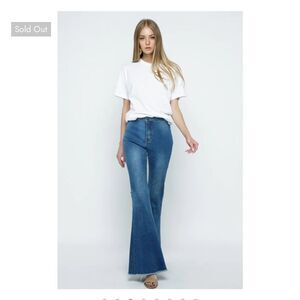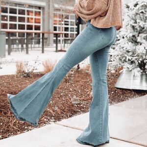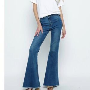 The absolute best basic bell bottom flare jeans EVER!!! Ultra High Rise with the perfect blue wash and gorgeous flare with Raw Distressed Hem! Lots of Stretch!!