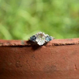This ring features three raw gemstones, one California; Lake County Diamond and two blue Montana Sapphires. Comes in black leather ring box.